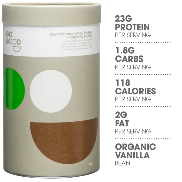 Made with world leading New Zealand whey protein and fortified with real, organic vanilla to flavour. Go Good organic vanilla protein is a nutritionally complete and delicious tasting protein source.