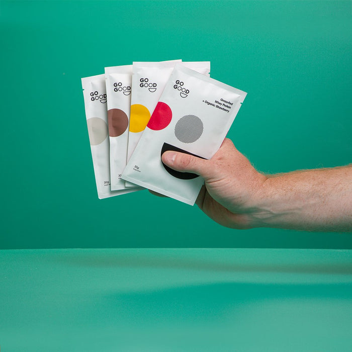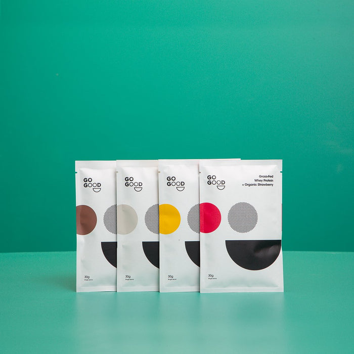 While not certified organic, our whey has all the advantages of 100% natural pastures. The milk for our whey proteins is derived from cows that are grass-fed and graze year-round on natural pastures. It is GMO-free, hormone-treatment-free, pesticide-free and undergoes minimal processing. All Go Good flavours are derived from certified organic ingredients.